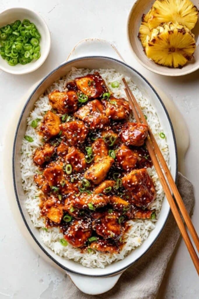 When it’s time to serve baked pineapple teriyaki chicken, think colorful and fresh. Plate it over steamed rice with scallions and sesame seeds. Or pair with stir-fried veggies for crunch. For an upgraded experience, serve with coconut rice and grilled pineapple spears. You can even turn it into a rice bowl with avocado, cucumber, and shredded cabbage.