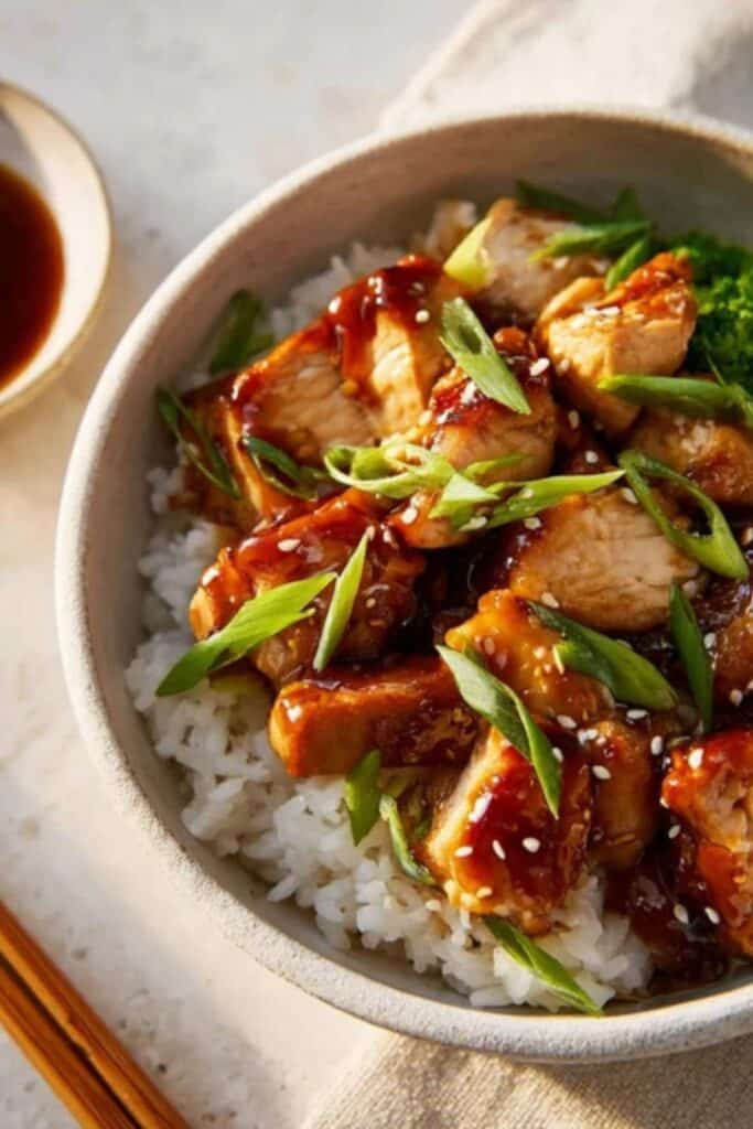 Teriyaki chicken tastes so flavorful because the sauce hits salty, sweet, and umami all at once. Soy sauce and sesame oil bring deep savory notes, while brown sugar and honey caramelize in the oven. Garlic and ginger add warmth and brightness. In a baked teriyaki chicken bowl, the sauce reduces in the oven and on the stove, so the flavors concentrate and cling to every piece of chicken and grain of rice.