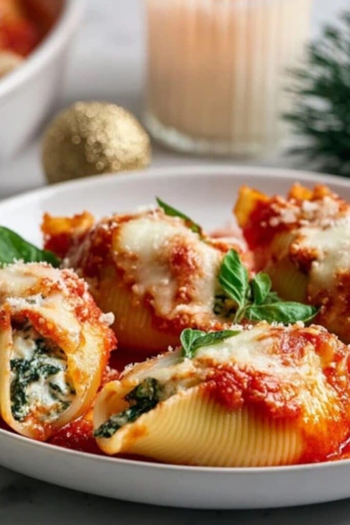 Presentation is everything. When serving the Best Christmas Stuffed Shells, layer them in a deep white ceramic dish and drizzle extra marinara before sprinkling fresh Parmesan on top. Add a touch of green basil for that unmistakable Christmas contrast.