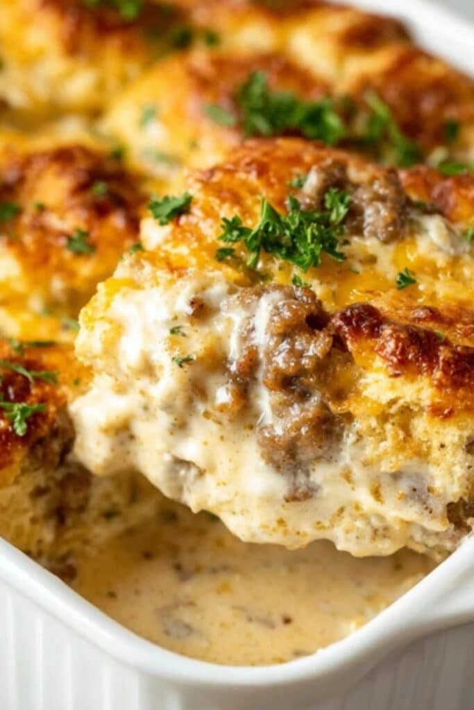 Then come the biscuits — fluffy, buttery, and tender inside. You can use homemade or store-bought (like those in the Cheddar Bay Biscuit Egg Breakfast Recipe). Layer the cut biscuits at the bottom of your casserole dish, pour the hot gravy over them, and let the oven work its magic.