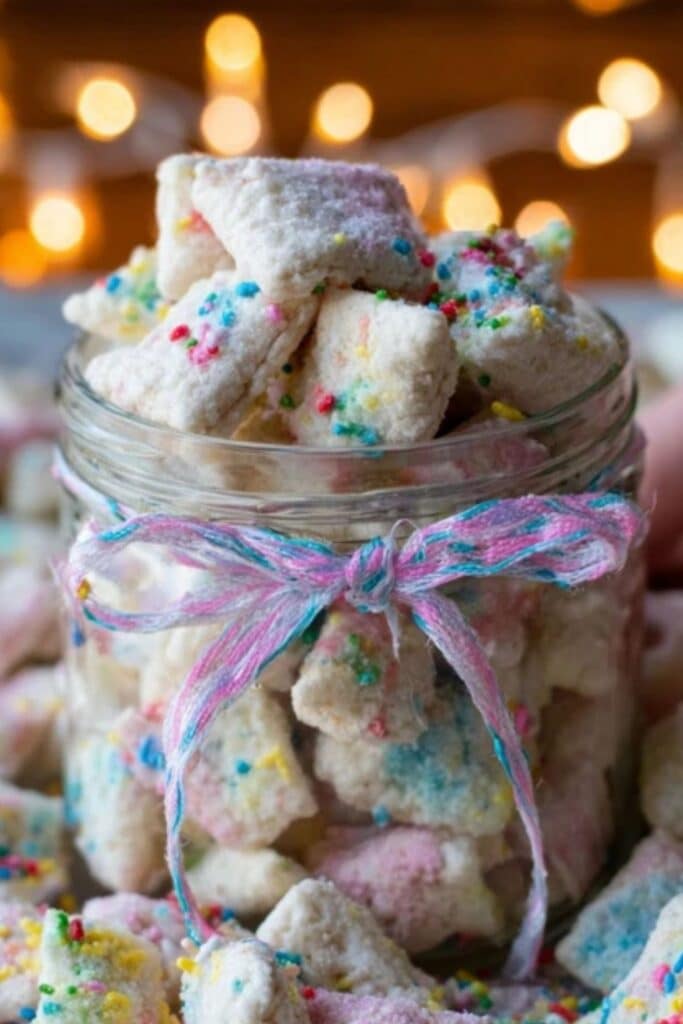 The best part about Cake Batter Puppy Chow is sharing it. Pack small portions in treat bags for bake sales or family gatherings. You can even use it as a party favor paired with mini desserts like the Old-Fashioned Bourbon Balls Recipe or Christmas Monster Cookies Recipe.
