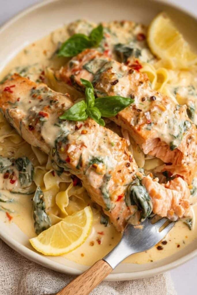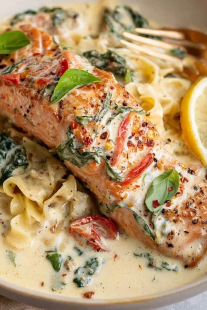 You can, but I don’t recommend it. Creamy sauces often separate after thawing, and salmon can lose that tender texture. If you must freeze, freeze the cooked salmon separately and make the sauce fresh later for the best Creamy Tuscan Salmon experience.