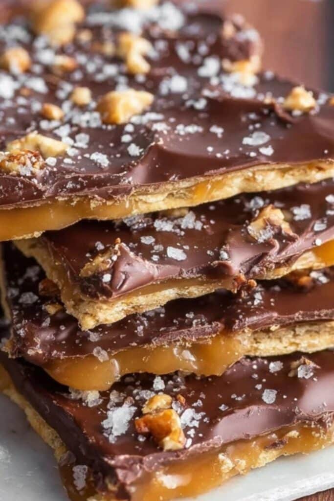 The real magic happens in the oven. The buttery sugar mixture seeps through the saltines, bubbling into a crisp toffee layer. When topped with melted chocolate, it turns into an elegant, addictive treat that tastes like it took hours.