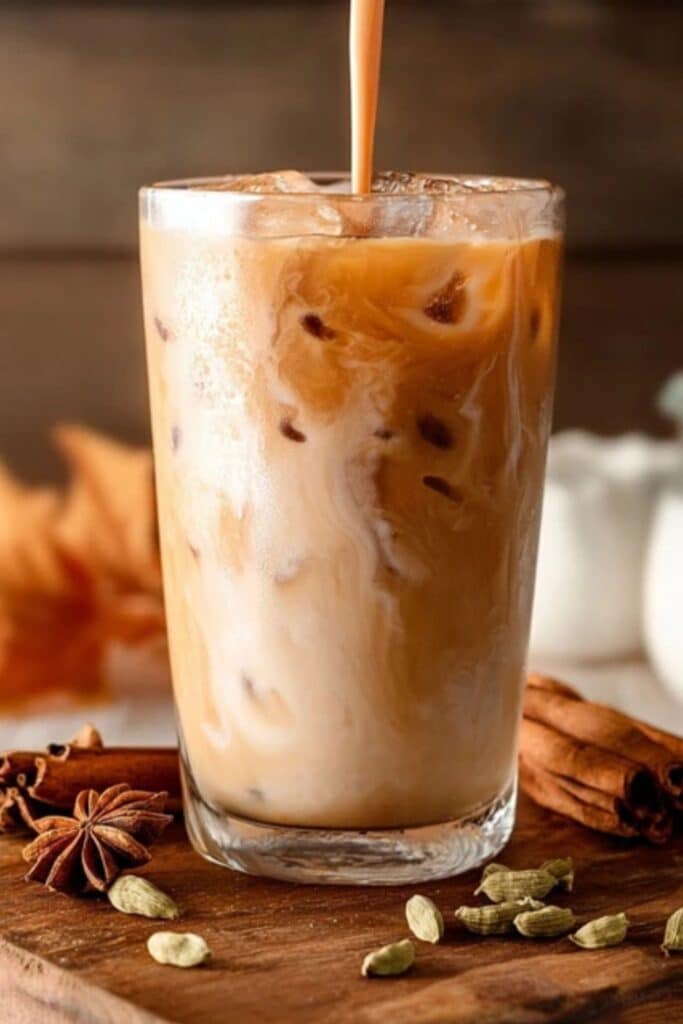Presentation matters. A true Iced Chai Tea Latte should look as good as it tastes. Start by pouring your chilled chai base into a tall glass with ice. Slowly add milk to create a layered effect — that swirling contrast between amber tea and creamy milk is irresistible.