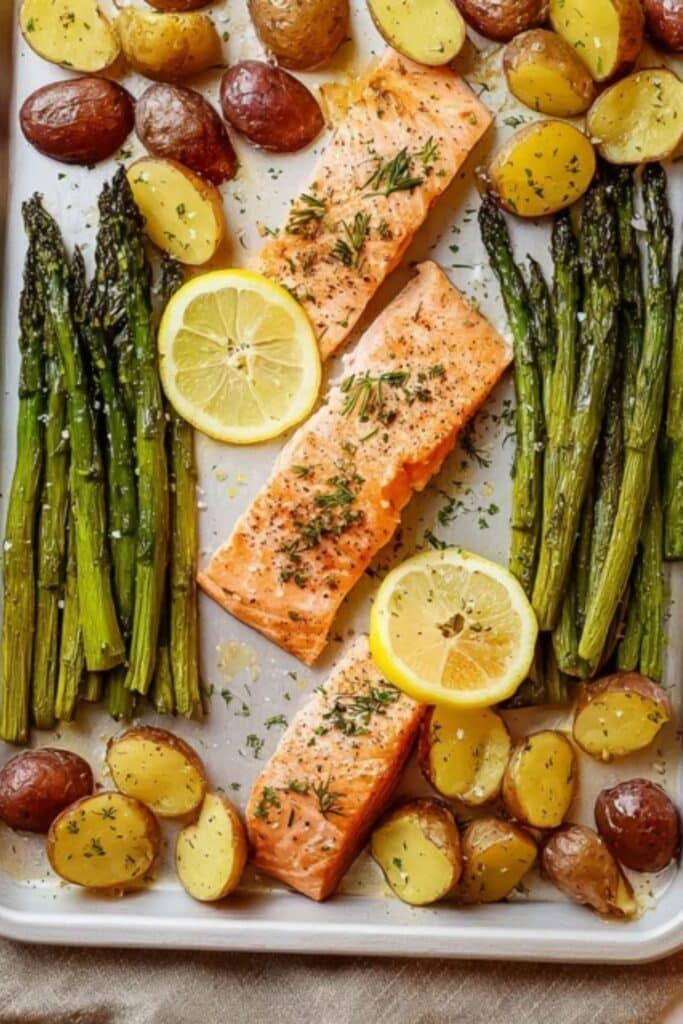 First, you only mess up one pan. You roast the potatoes, then you slide the salmon and asparagus right onto the same sheet, so cleanup stays unbelievably simple. Because everything cooks together, the flavors mingle, and you get juicy salmon, crispy potatoes, and tender asparagus in each bite.