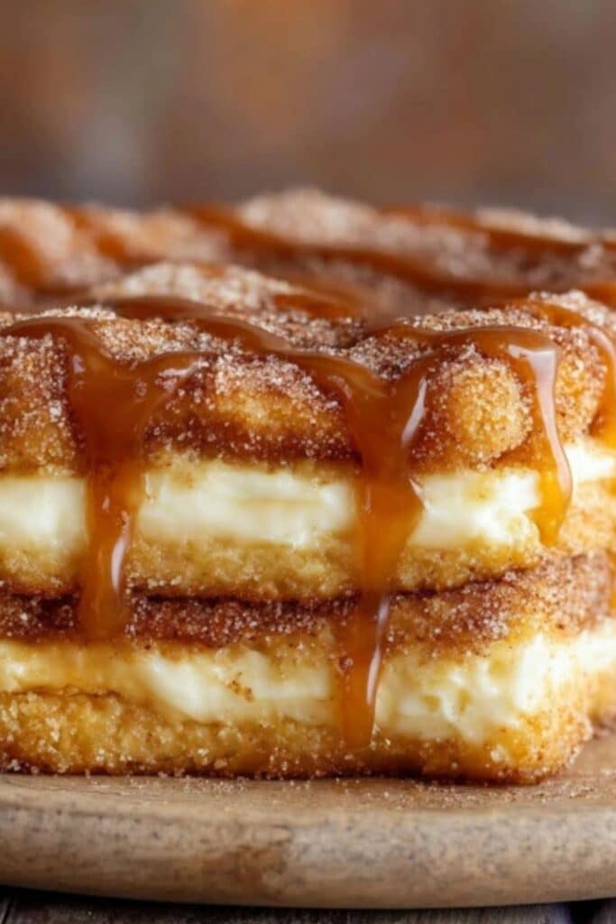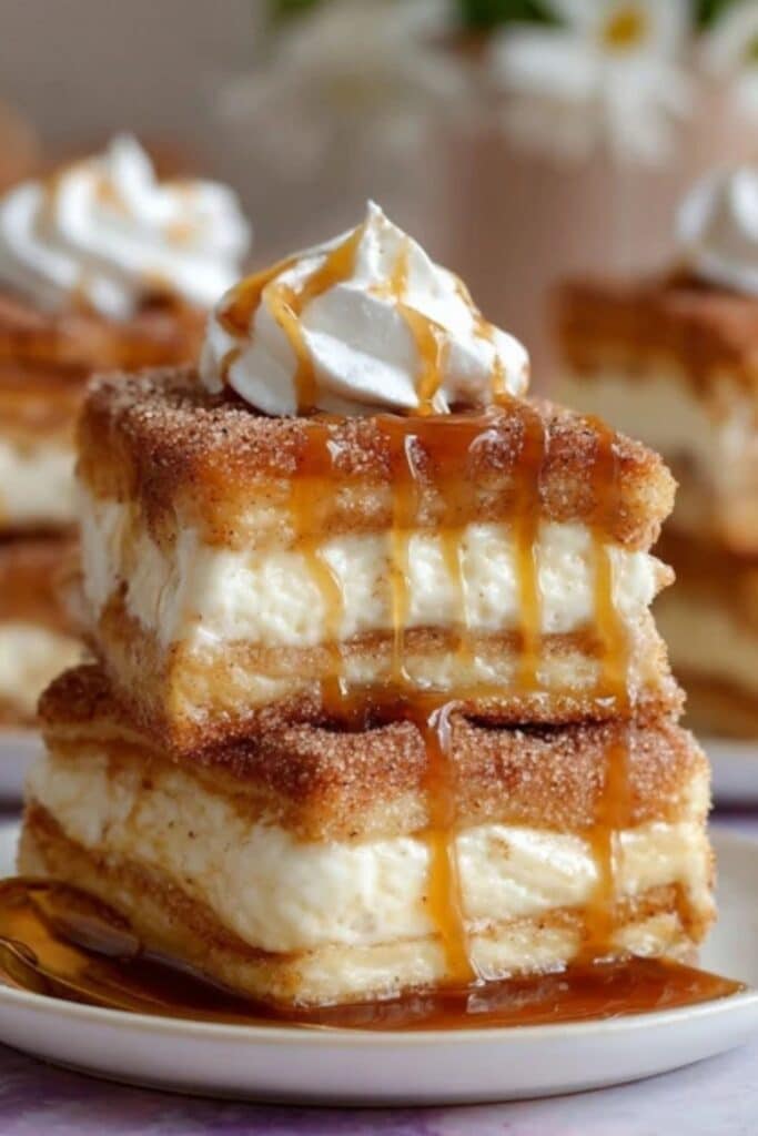 Now comes the core: a silky cheesecake mixture. Blend cream cheese, sugar, vanilla extract, and an egg until smooth. The goal is a batter that’s thick but pourable. Spread it evenly over your churro base, then top it with another sheet of dough. Brush with melted butter, sprinkle on more cinnamon sugar, and get ready for magic in the oven.