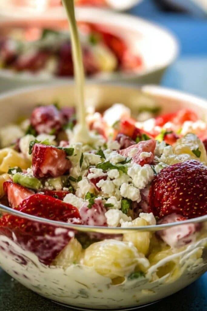 You don’t need heavy dressings in strawberry feta pasta salad. A simple balsamic vinaigrette does the trick. Try mixing balsamic vinegar, extra virgin olive oil, a touch of honey or maple syrup, and Dijon mustard. This creates a light coating that clings to the pasta without overpowering the strawberries.