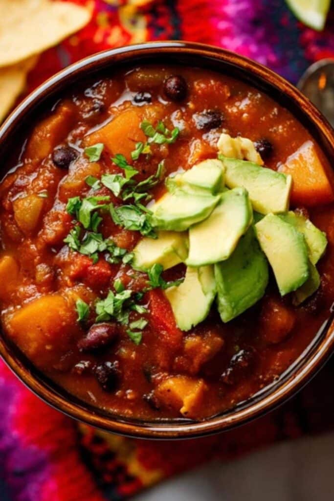 Don’t skip the toppings—they turn a simple chili into something crave-worthy. Top your vegetarian pumpkin chili with avocado slices, crushed tortilla chips, or a dollop of vegan sour cream. Fresh cilantro and green onions add a pop of freshness. A sprinkle of nutritional yeast gives a cheesy flavor.